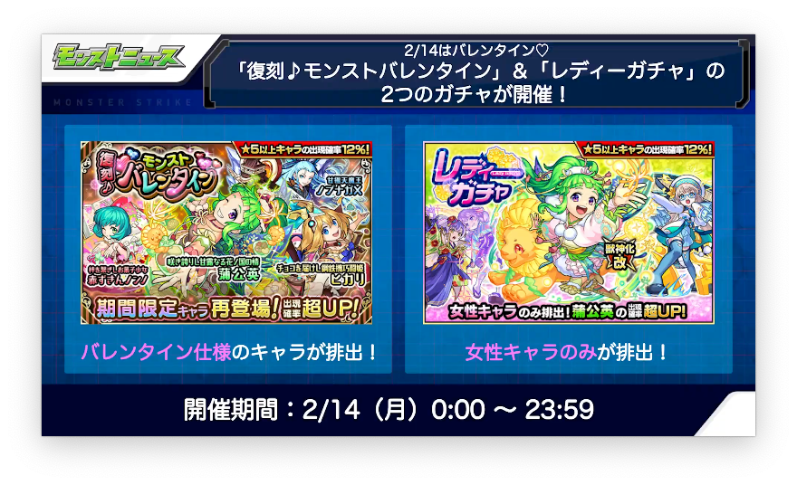 【速報】※まさかの衝撃発表※『バレンタインガチャ』『レディーガチャ』同時開催決定キタ━━━━ヽ(☆∀☆ )ノ━━━━!!!!【モンスト】