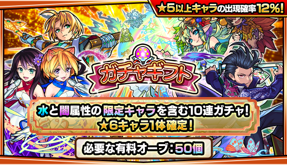 【モンスト】※公式※星6キャラ1体確定&水・闇属性限定キャラを含む10連ガチャ!!今月の「ガチャギフト」開催情報公開きたあああ!!!
